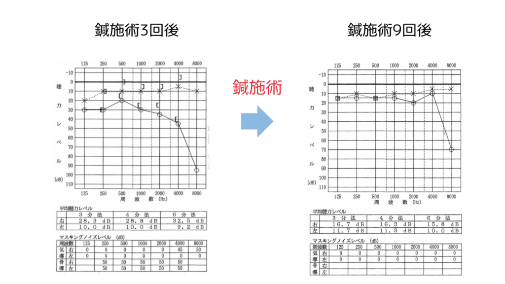 初回は頚部の緊張緩和を目的として、脊柱近傍のツボと臀部に施術を行った。その後、右膝外側部や肋骨上部の緊張部位への施術を追加したところ、変化が現れ始めた。施術を3回実施した時点で、既存の高音の耳鳴りに加えて低い「ボー」という音が断続的に出現するようになった。6回目以降、耳鳴りの音量が減少し始め、9回目終了時点での聴力検査で改善が確認された。聴力の回復は6回目までに得られたが、その後も残存する耳鳴りに対して施術を継続し、段階的な改善が得られた。施術期間中に出現する肩こりに対しては、その都度対応して軽減を図った。