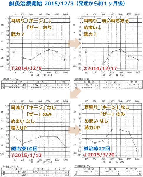 来院時、体調は安定しておらず、鍼治療を開始してもすぐに回復の傾向が見られなかった。体調や耳の状態が悪い方に向かっている最中に鍼治療を開始したため、悪化を食い止めるだけで精一杯であったというのが正直な感想である。しばらく「これ以上は悪化しないように」という意味を込めて治療を行った。10回を終えた時、眩暈は消え、耳鳴りから高い「キーン」という音が消えていた。聴力は回復の兆候が表れた。その後も治療を続けた結果、聴力の回復が少し見られたが、大きな成果は得られなかった。
