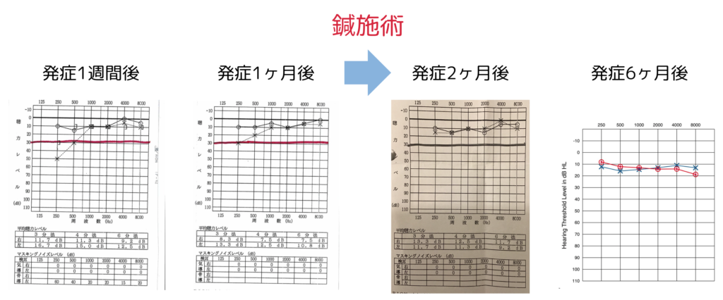 約1ヶ月前に突然発症した「低音型突発性難聴」である。初めは右耳に違和感を感じ、その後左耳に異変を感じるようになった。主な症状は音の反響と左耳の低音域における聴力低下である。自分の声やテレビの音が響き、ワンワンと反響する状態が続いていた。医療機関にてステロイドの点滴治療を受けたが、十分な改善は得られなかった。また、頭痛や首コリ、肩こりなどの随伴症状も見られ、症状が気になり仕事に支障をきたしている状態であった。